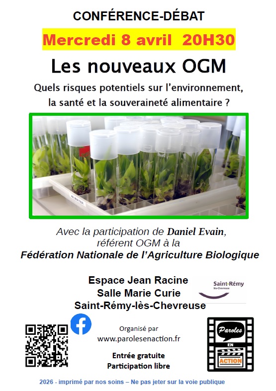 Lors de la conférence-débat Daniel Evain nous a informé de la pétition en cours en vue d’alerter les eurodéputés sur la réglementation des nouveaux OGM. petitionogm.agirpourlenvironnement.org L’Union européenne s’apprête à bouleverser radicalement et sans aucune possibilité de retour en arrière notre agriculture et notre alimentation. < Elle pourrait autoriser dans les prochains mois une nouvelle génération d’OGM dans nos champs et nos assiettes sans aucun contrôle ni garde-fou.